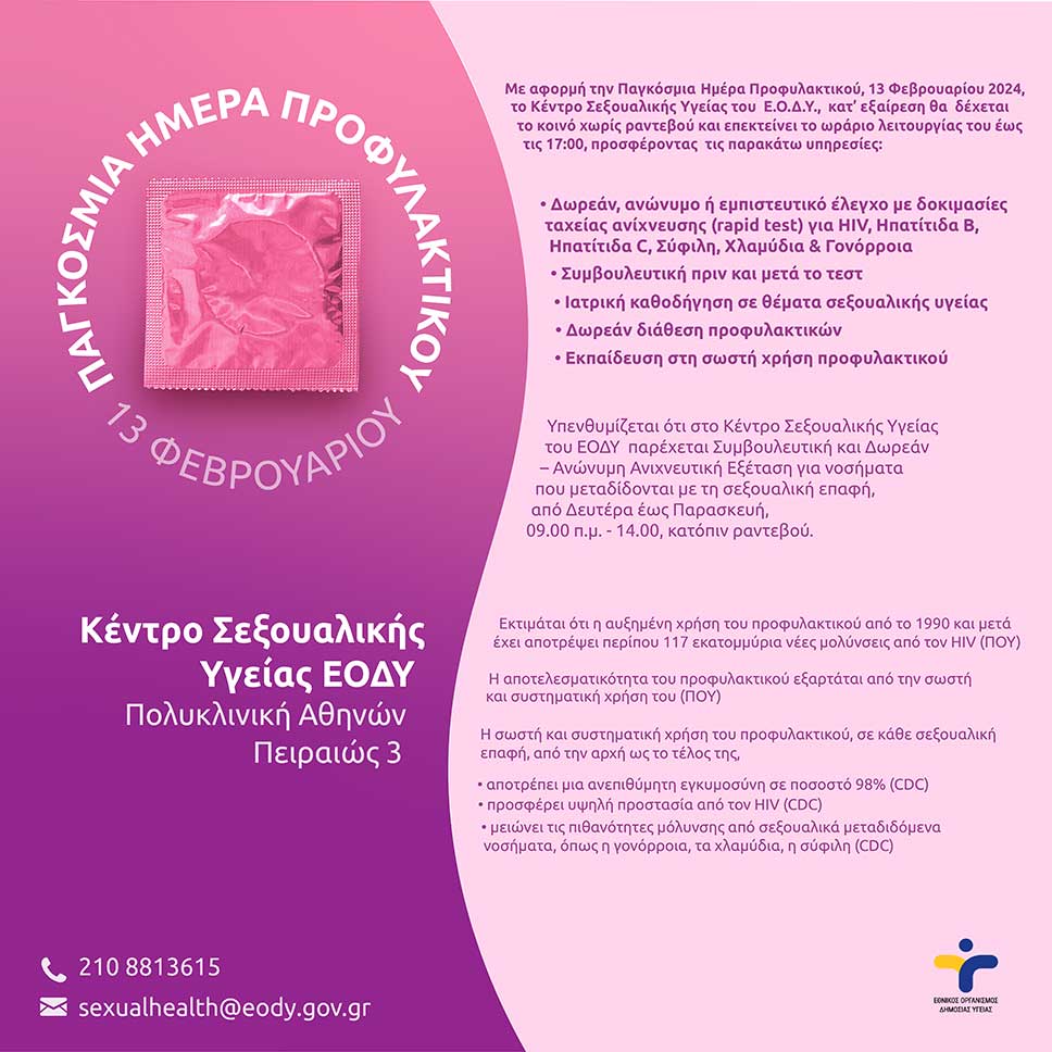 Με αφορμή την Παγκόσμια Ημέρα Προφυλακτικού, 13 Φεβρουαρίου 2024, το Κέντρο Σεξουαλικής Υγείας του ΕΟΔΥ, κατ’ εξαίρεση, θα δέχεται το κοινό χωρίς ραντεβού, επεκτείνοντας το ωράριο λειτουργίας του έως τις 17:00.