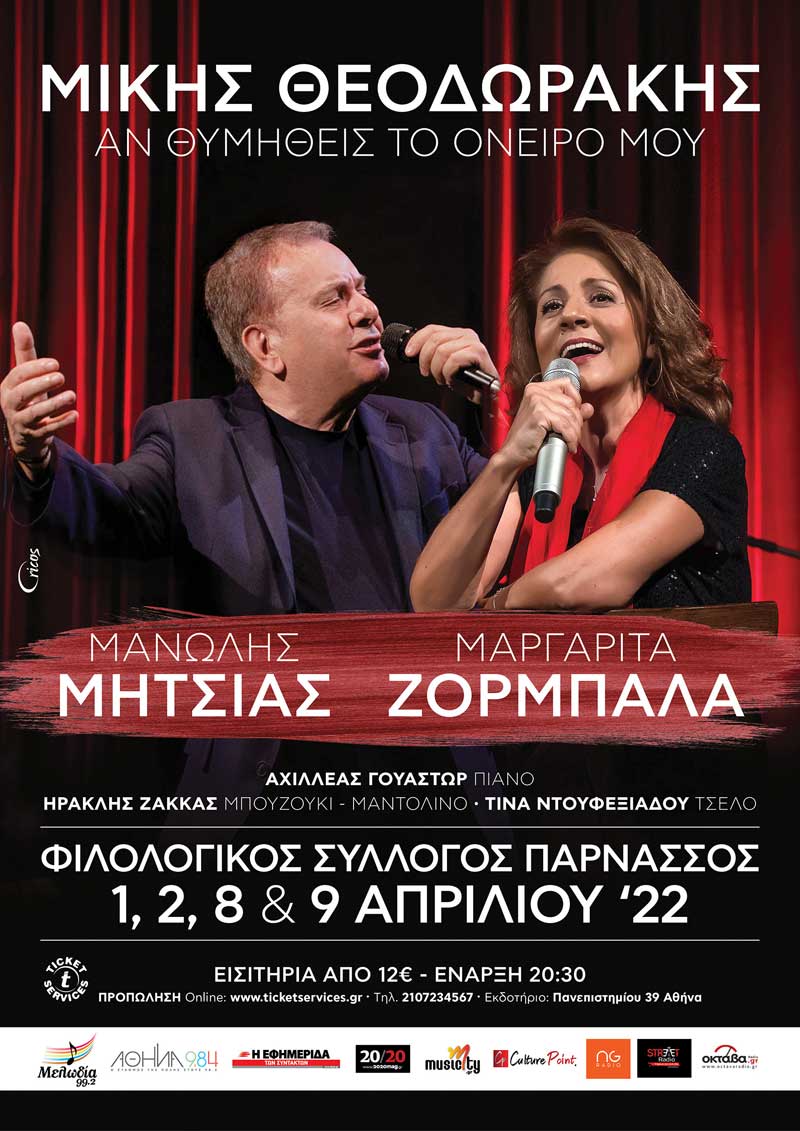 Ο Μανώλης Μητσιάς και η Μαργαρίτα Ζορμπαλά μάς καλωσορίζουν στη σκηνή του ιστορικού χώρου του Φιλολογικού Συλλόγου ΠΑΡΝΑΣΣΟΣ, για τέσσερα μοναδικά ρεσιτάλ, αφιερωμένα στο έργο του οικουμενικού Μίκη Θεοδωράκη, τις Παρασκευές 1 και 8 και τα Σάββατα 2 και 9 Απριλίου.