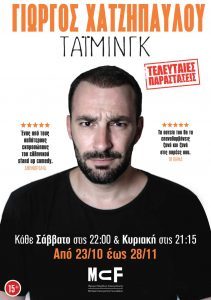 Αφού περιόδευσε σ’ όλη την Ελλάδα, αλλά και την Κύπρο το καλοκαίρι που μας πέρασε, ο Γιώργος Χατζηπαύλου επιστρέφει στο καλλιτεχνικό του «σπίτι», στο Ίδρυμα Μιχάλης Κακογιάννης, για θριαμβευτικό φινάλε! Last call! Δώδεκα τελευταίες παραστάσεις για το «Τάιμινγκ», τη sold out stand-up comedy παράσταση του κορυφαίου Έλληνα κωμικού.