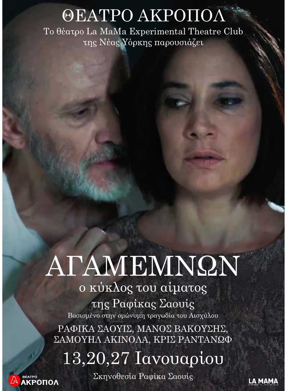 Μετά την παγκόσμια πρεμιέρα του έργου στις ΗΠΑ, η οποία στέφθηκε με απόλυτη επιτυχία αποσπώντας εξαιρετικές κριτικές, το ιστορικό θέατρο La MaMa της Νέας Υόρκης φέρνει και στην Ελλάδα την παράσταση «Αγαμέμνων: ο κύκλος του αίματος». Η τολμηρή νέα ανάγνωση της Ραφίκας Σαουίς, βασισμένη στην ομώνυμη τραγωδία του Αισχύλου, έρχεται στο Θέατρο Ακροπόλ για 3 μόνο βραδιές, στις 13, 20 και 27 Ιανουαρίου, προτού συνεχίσει την ευρωπαϊκή περιοδεία της.