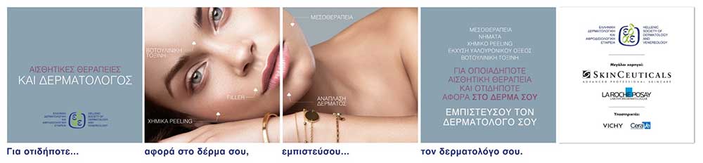 «Το δέρμα μας είναι πολύτιμο. Για θεραπείες Αισθητικής Δερματολογίας και για οτιδήποτε αφορά στο δέρμα σου εμπιστεύσου τον Δερματολόγο σου!»: Αυτό είναι το κεντρικό μήνυμα της καμπάνιας της Ελληνικής Δερματολογικής & Αφροδισιολογικής Εταιρείας για την Αισθητική Δερματολογία, η οποία απευθύνεται σε γυναίκες αλλά και άνδρες που επιθυμούν να βελτιώσουν την εμφάνισή τους. Σκοπός της η ενημέρωση και ευαισθητοποίηση του κοινού, επικοινωνώντας την απενοχοποίηση της ανάγκης για ομορφιά, το εύρος των πράξεων της Αισθητικής Δερματολογίας, αλλά και τους κινδύνους που μπορεί να έχουν αυτές οι εφαρμογές.