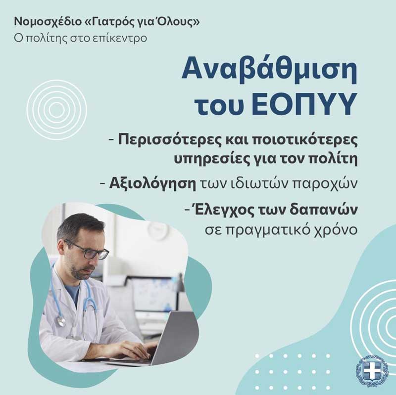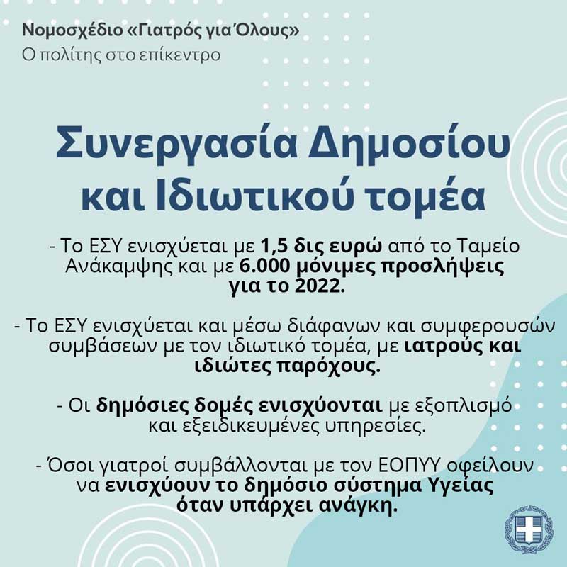 Η απόφασή μας να ενώσουμε τις υγειονομικές δυνάμεις της χώρας κρατικές και ιδιωτικές σε ένα πιο μεγάλο και πραγματικά Εθνικό σύστημα υγείας γίνεται κυρίως για να καλύψουμε το μεγάλο έλλειμμα ιατρών και υπηρεσιών που μαστίζει την ελληνική περιφέρεια. Σταθερή μας επιδίωξη να έχουν πρόσβαση σε γιατρό όλοι οι πολίτες της ελληνικής Περιφέρειας. Με το νομοσχέδιο καλύπτονται τα κενά του ΕΣΥ με επιπλέον προσλήψεις και συμβάσεις με ιδιώτες ιατρούς. Όσοι ιατροί συμβάλλονται με τον ΕΟΠΥΥ παρέχουν και υπηρεσίες στο ΕΣΥ, όταν απαιτείται. Με αυτόν τον τρόπο μειώνονται τα κενά του ΕΣΥ, αυξάνονται οι ιατροί και βελτιώνεται η πρόσβαση του πολίτη στις υγειονομικές δομές.