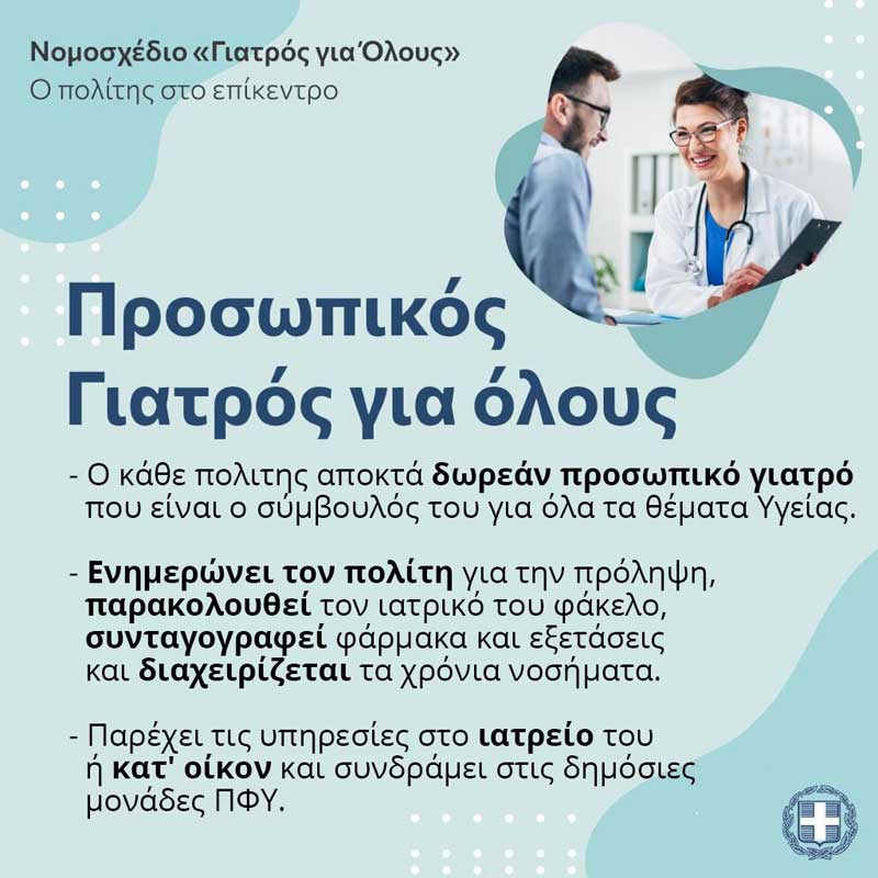 Οι υπηρεσίες του προσωπικού γιατρού θα παρέχονται δωρεάν για τους πολίτες που έχουν εγγραφεί στη λίστα του προσωπικού ιατρού που έχουν επιλέξει. Θα πραγματοποιούν επισκέψεις, θα συνταγογραφούν τα φάρμακα τους και θα παίρνουν κατευθύνσεις χωρίς να πληρώνουν.