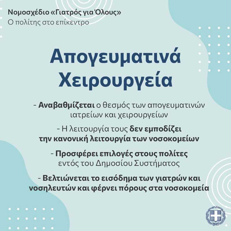 Με τα απογευματινά χειρουργεία ο ασθενής θα έχει μια επιπλέον οικονομικότερη επιλογή από τις ιδιωτικές κλινικές, χωρίς να θίγεται καθόλου η πρωινή λίστα των χειρουργείων του ΕΣΥ. Ο ιατρός θα έχει επιπλέον οφέλη και συνολικά το προσωπικό -νοσηλευτές και διοικητικό προσωπικό– ενώ και το νοσοκομείο θα έχει έσοδα που θα τα χρησιμοποιεί το ίδιο επιστρέφοντας αυτά τα χρήματα στους πολίτες βελτιώνοντας τις παρεχόμενες υπηρεσίες. Με αυτόν τον τρόπο δίνουμε τη δυνατότητα στον πολίτη να μπορεί να επιλέγει ιατρό του δημόσιου συστήματος. Οι μόνοι που χάνουν από τα απογευματινά χειρουργεία είναι οι ιδιώτες πάροχοι που θα δουν ένα ανταγωνιστικό και ισχυρό δημόσιο σύστημα. Τα απογευματινά χειρουργεία τα θέλουν όσοι επιθυμούν να εξυπηρετήσουν τις ανάγκες του πολίτη και του ΕΣΥ και δεν τα θέλουν όσοι επιθυμούν να εξυπηρετούν τις ανάγκες των ιδιωτικών κλινικών για παραπάνω κέρδη. Με πολύ λιγότερο κόστος από ό,τι στον ιδιωτικό τομέα, οι πολίτες θα χρησιμοποιούν τα απογευματινά χειρουργεία, κοστολογημένα με μικρό κόστος.