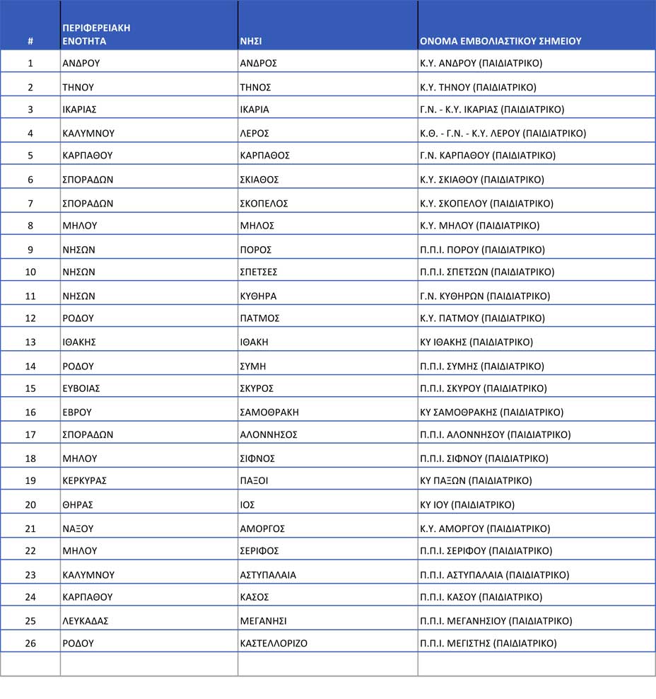 Οι εμβολιασμοί θα διενεργηθούν σε Κέντρα Υγείας ή σε Πολυδύναμα Περιφερειακά Ιατρεία των νησιών, στις 28 Ιανουαρίου και στις 4 Φεβρουαρίου.