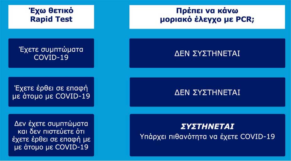 - Εάν το rapid τεστ είναι θετικό, θα πρέπει να επαναληφθεί μετά από 2 ημέρες, ειδικά εάν υπάρχει κλινική υποψία για COVID-19 ή εάν ο επιπολασμός της COVID-19 στον πληθυσμό είναι χαμηλός. Εάν στην επανάληψη το rapid τεστ είναι θετικό, τότε πρέπει να επιβεβαιωθεί η λοίμωξη με μοριακό έλεγχο (RT-PCR), το άτομο να μπει σε καραντίνα και να ειδοποιήσει τις υγειονομικές υπηρεσίες. Εάν στην επανάληψη το rapid τεστ είναι αρνητικό, τότε δεν υπάρχουν ενδείξεις λοίμωξης από SARS-CoV-2.