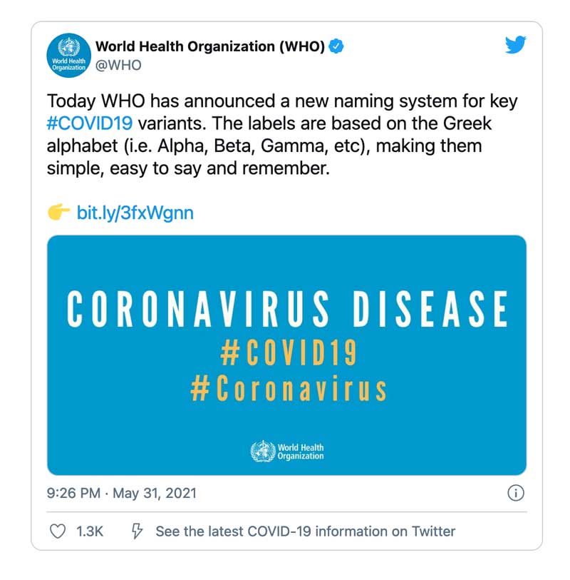 – Το υπο-στέλεχος Β.1.617.2, το οποίο αποτελεί αιτία διεθνούς ανησυχίας, θα ονομάζεται πλέον Δέλτα.