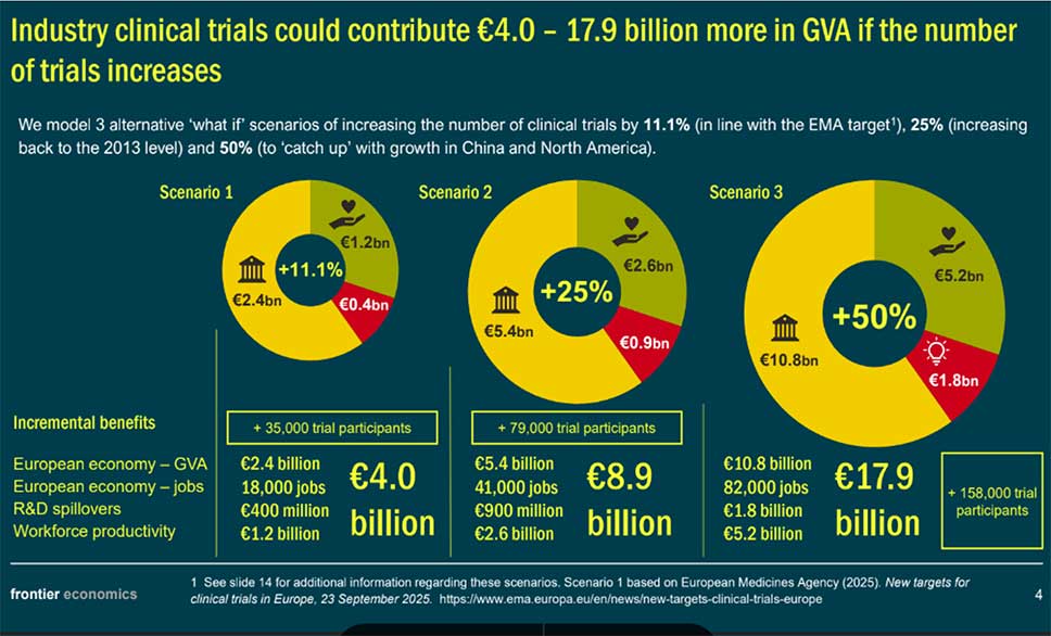 Η έρευνα εκτιμά ότι οι κλινικές μελέτες που χρηματοδοτούνται από τη βιομηχανία παράγουν ήδη 35,7 δισ. ευρώ σε οικονομική αξία ετησίως σε ολόκληρο τον Ευρωπαϊκό Οικονομικό Χώρο (ΕΟΧ), συνδυάζοντας 21,7 δισ. ευρώ από την ίδια τη δραστηριότητα των κλινικών μελετών, 3,6 δισ. ευρώ από οφέλη στην Έρευνα & Ανάπτυξη, και 10,4 δισ. ευρώ από τη βελτιωμένη παραγωγικότητα του εργατικού δυναμικού μέσω της αποτροπής 26,9 εκατ. ημερών ασθενείας.