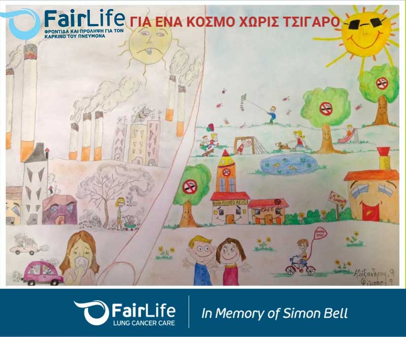 Με εκκίνηση το μήνυμα της FairLife L.C.C. «H ζωή να κόβει την ανάσα και όχι ο καρκίνος του πνεύμονα» και στο πλαίσιο του εορτασμού της Παγκόσμιας Ημέρας Δράσεων για την Κλιματική Αλλαγή αλλά και της Παγκόσμιας Ημέρας του Πνεύμονα (25.09.2021), γίνεται προσπάθεια να ευαισθητοποιηθούν τα παιδιά και οι οικογένειές τους για τις συνέπειες του τσιγάρου στο περιβάλλον, τον κοινό μας πνεύμονα, αλλά και στο αναπνευστικό μας σύστημα και στην υγεία μας. Στα ζωγραφικά έργα που παρουσιάζονται, με τον τίτλο «Για έναν κόσμο χωρίς καπνό, χωρίς τσιγάρο», τα παιδιά και οι έφηβοι αποτύπωσαν με τη δική τους ματιά τις επιπτώσεις του τσιγάρου.