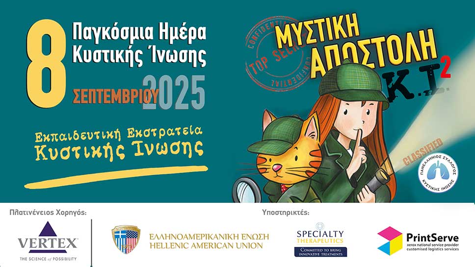 Ο Πανελλήνιος Σύλλογος Κυστικής Ίνωσης ευχαριστεί θερμά τον Πλατινένιο Χορηγό Vertex Pharmaceuticals της Εκπαιδευτικής Εκστρατείας “Μυστική Αποστολή: K.I., καθώς και τους αρχικούς υποστηρικτές Special Therapeutics, Ελληνοαμερικάνικη Ένωση, PrintServe για την έμπρακτη στήριξή τους στην εκπαιδευτική και κοινωνική διάσταση της υγείας, δίνοντας ανάσα και γνώση στις επόμενες γενιές.