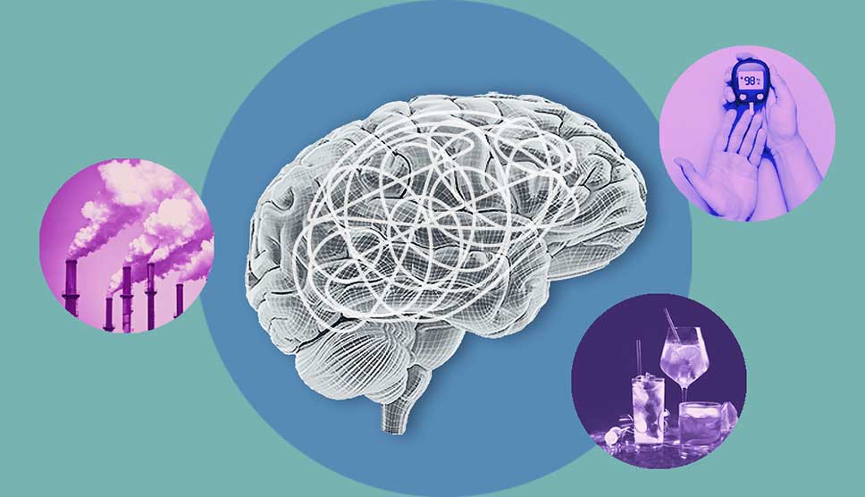 - Οι κρανιοεγκεφαλικές κακώσεις, ειδικά όταν είναι σοβαρές ή επαναλαμβανόμενες, αυξάνουν επίσης σημαντικά τον κίνδυνο πολλά χρόνια αργότερα. Ακόμη, το κάπνισμα επιβαρύνει τα αγγεία, αυξάνει τον κίνδυνο εγκεφαλικού και σχετίζεται με μικρότερο όγκο εγκεφάλου και χειρότερη μνήμη. Τέλος, ακόμη και η πολύ δυνατή χρήση ακουστικών μπορεί να βλάψει την ακοή, και η απώλεια ακοής σε μεγαλύτερες ηλικίες έχει συνδεθεί με προβλήματα μνήμης και εγκεφαλικής λειτουργίας.