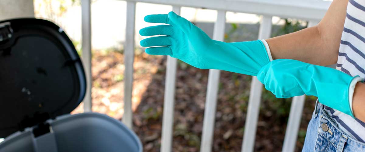 • Χρησιμοποιούμε γάντια για να κλείσουμε και να δέσουμε τις σακούλες και να τις μεταφέρουμε στον κάδο απορριμμάτων. Τα γάντια αυτά, μόλις γυρίσουμε σπίτι, τα πετάμε στις επόμενες σακούλες απορριμμάτων που θα χρησιμοποιήσουμε.